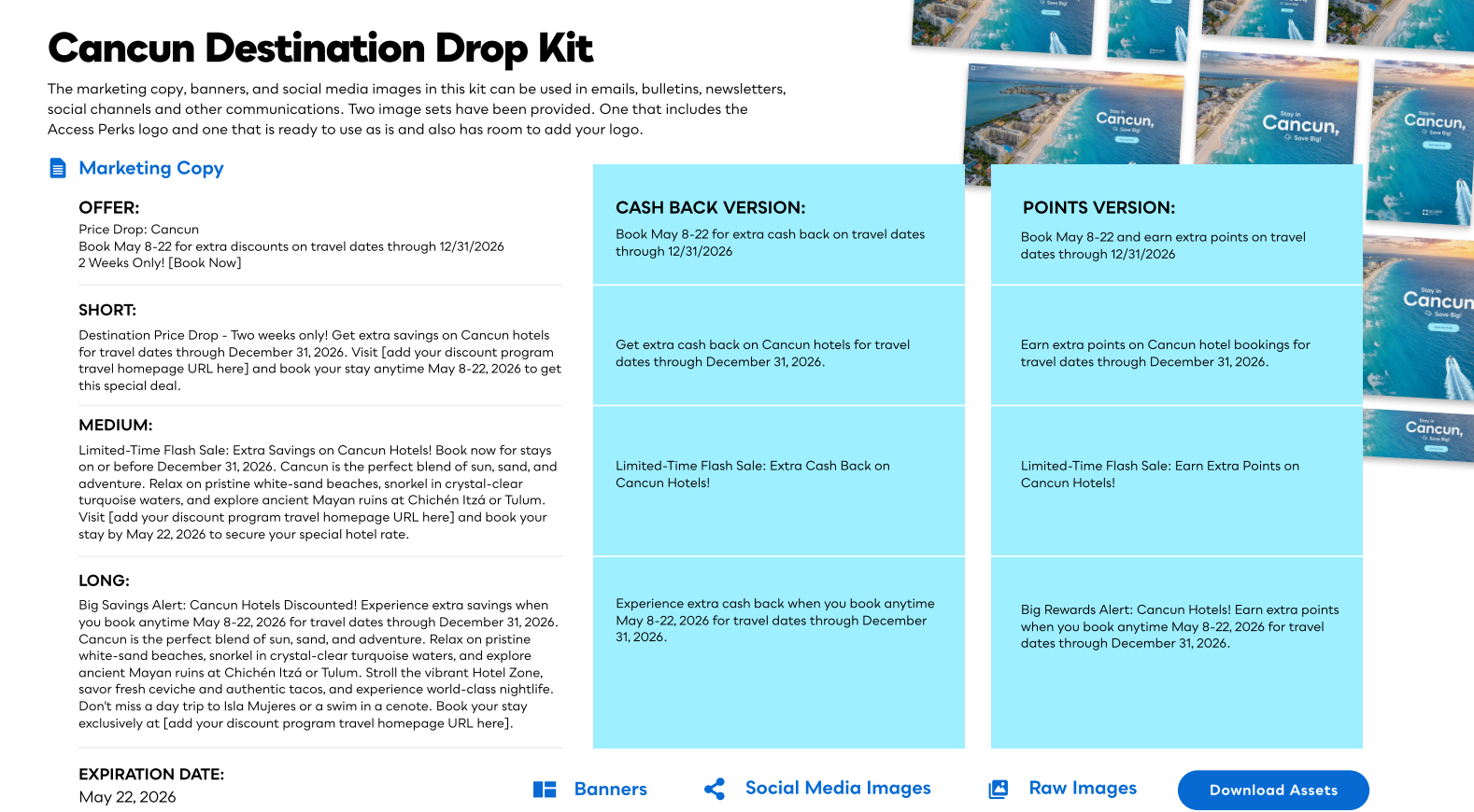 Each toolkit features a specific category, product feature, or merchant from your program. The kit includes web and email banners, social media content, print and digital flyers, marketing copy, and other information to help you promote your program.