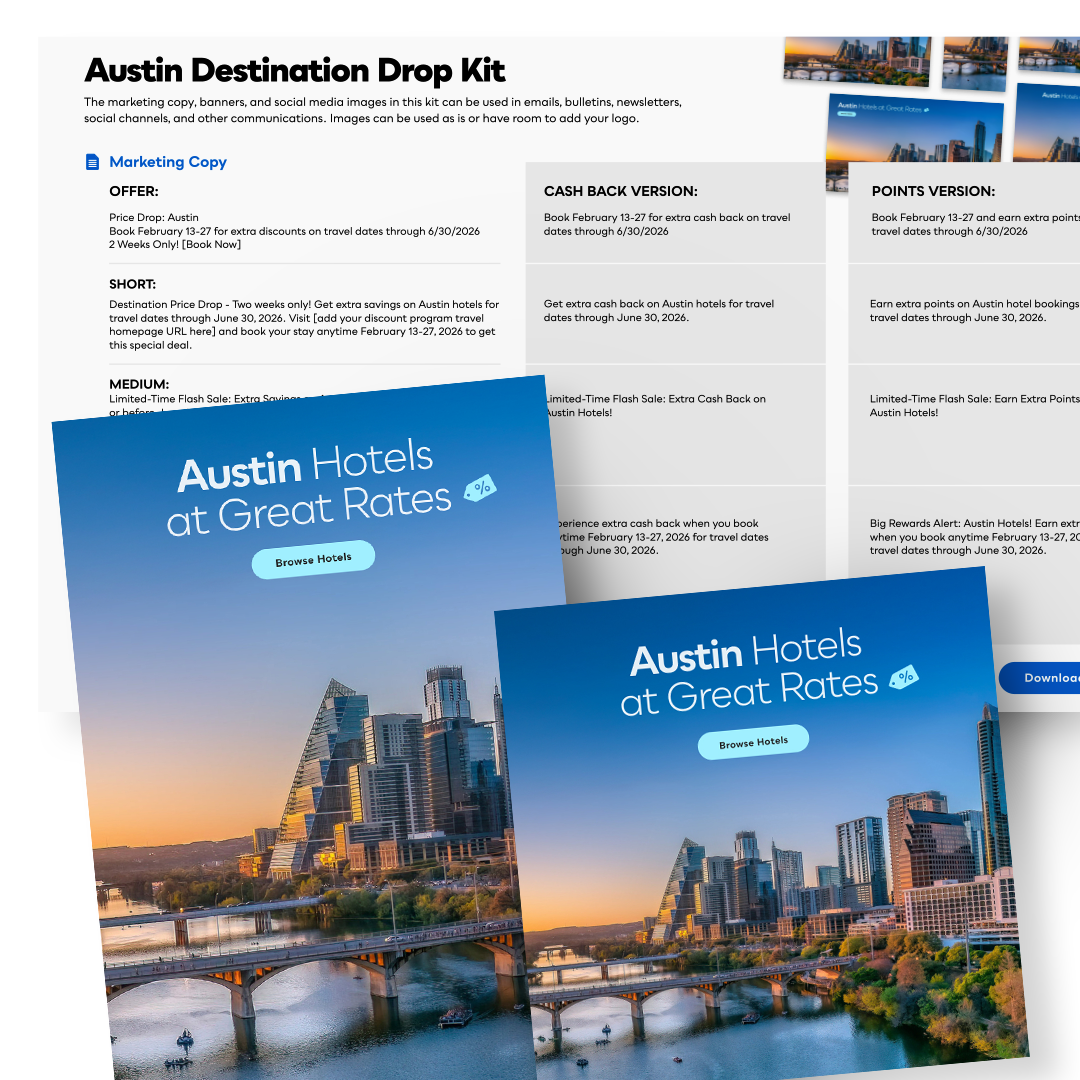 Each toolkit features a specific category, product feature, or merchant from your program. The kit includes web and email banners, social media content, print and digital flyers, marketing copy, and other information to help you promote your program.